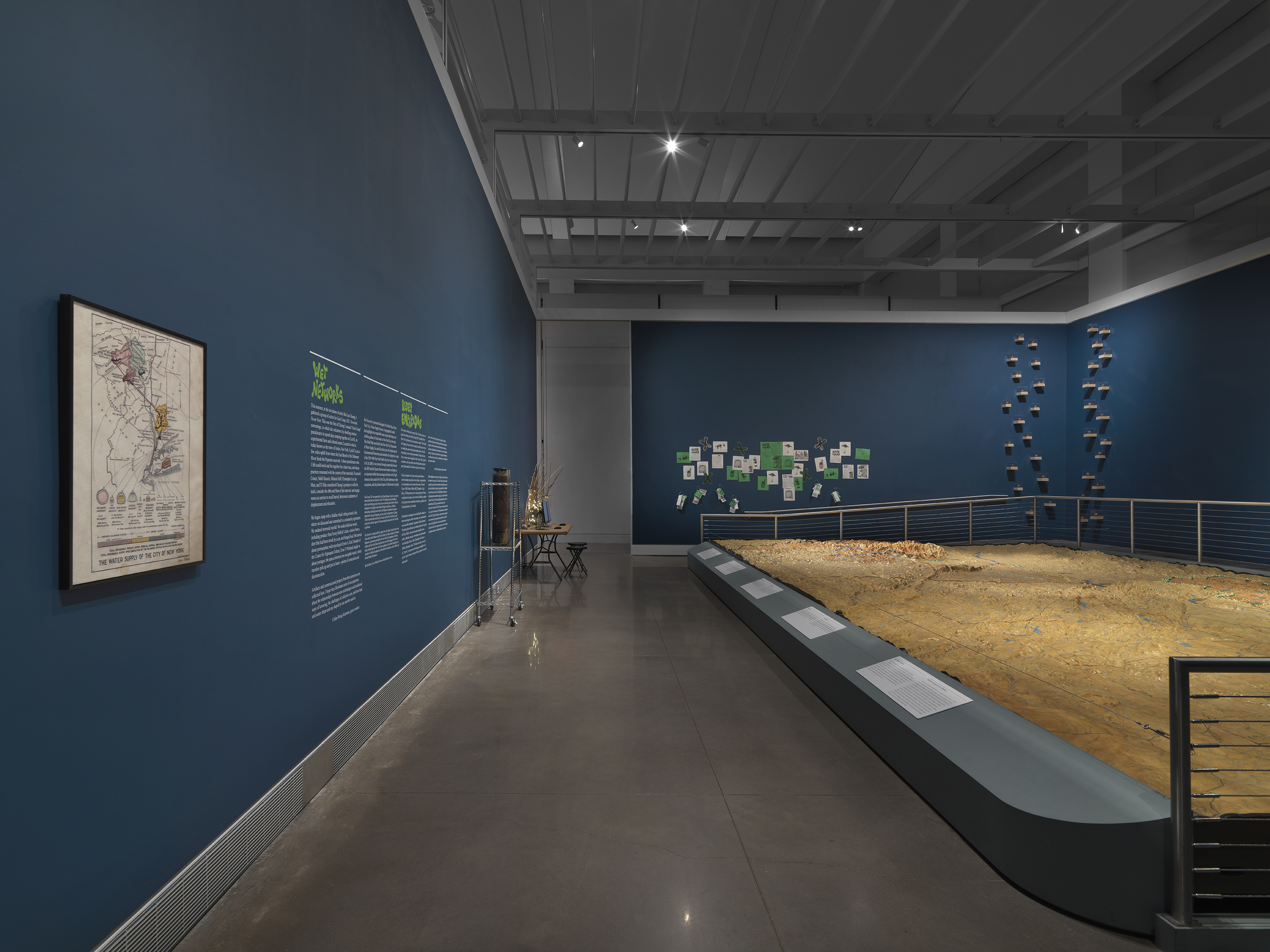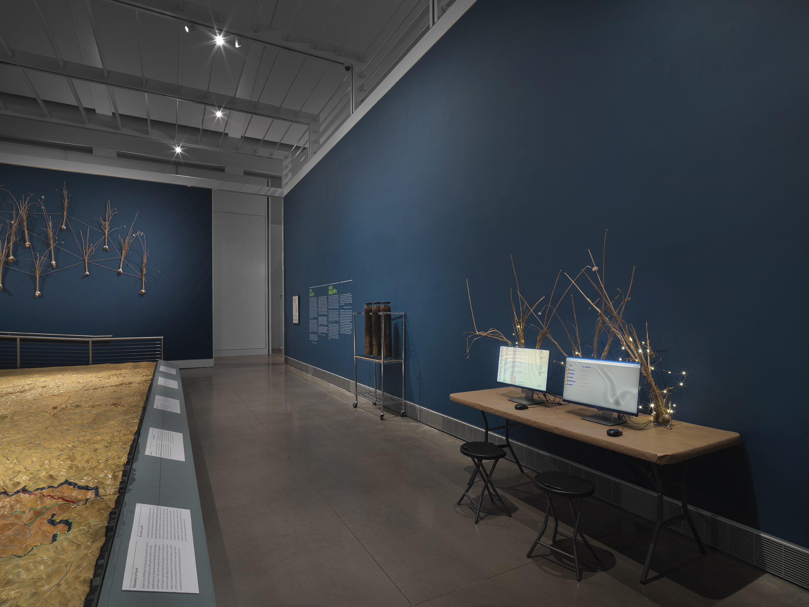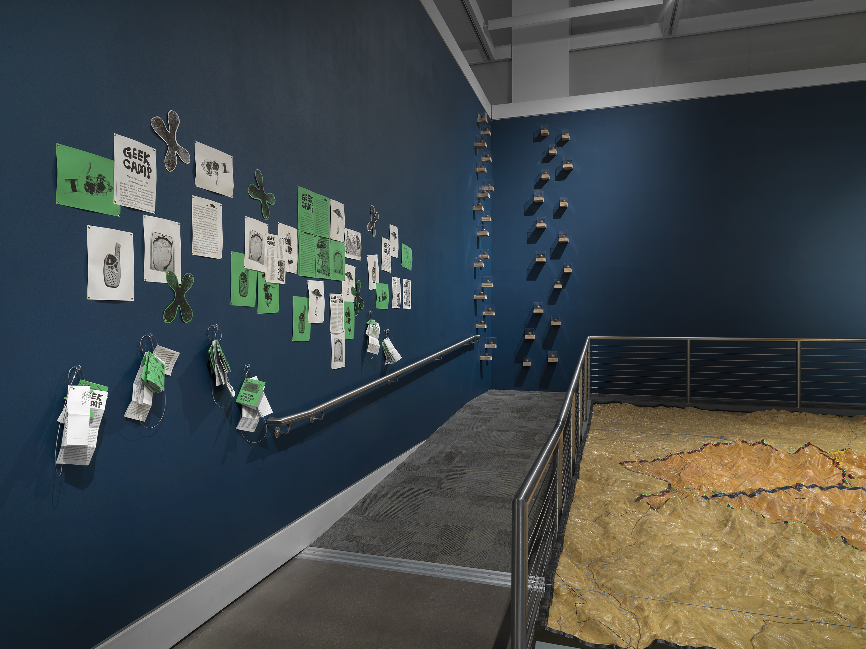 I curated Wet Networks in the Queens Museum’s Watershed gallery which houses The Relief Map of New York City’s Water Supply System. The exhibition presented artifacts and commissions from an experimental residency at artist Shu Lea Cheang’s Catskill farm, located near the Pepacton reservoir, which feeds New York City. I facilitated the residency for artists Tecumseh Ceaser, Nabil Hassein, Melanie Hoff, Christopher Lin, Jan Mun, and TJ Shin, setting up camp and meals, authoring a community agreement, and inviting teachers: a local mycologist and the Founder of the Center for Algonquin Culture. Beyond the desire to highlight the educational artifact, The Relief Map, I wanted to discover how living and learning with artists impacts the outcome of an exhibition. The artist commissions provided encounters with images, sculpture, soil and living matter, databases, and Algonquin history, that illuminate the relationships between new technologies and traditional ways of knowing, the challenges of collective care, and how land and water shape and are shaped by us.