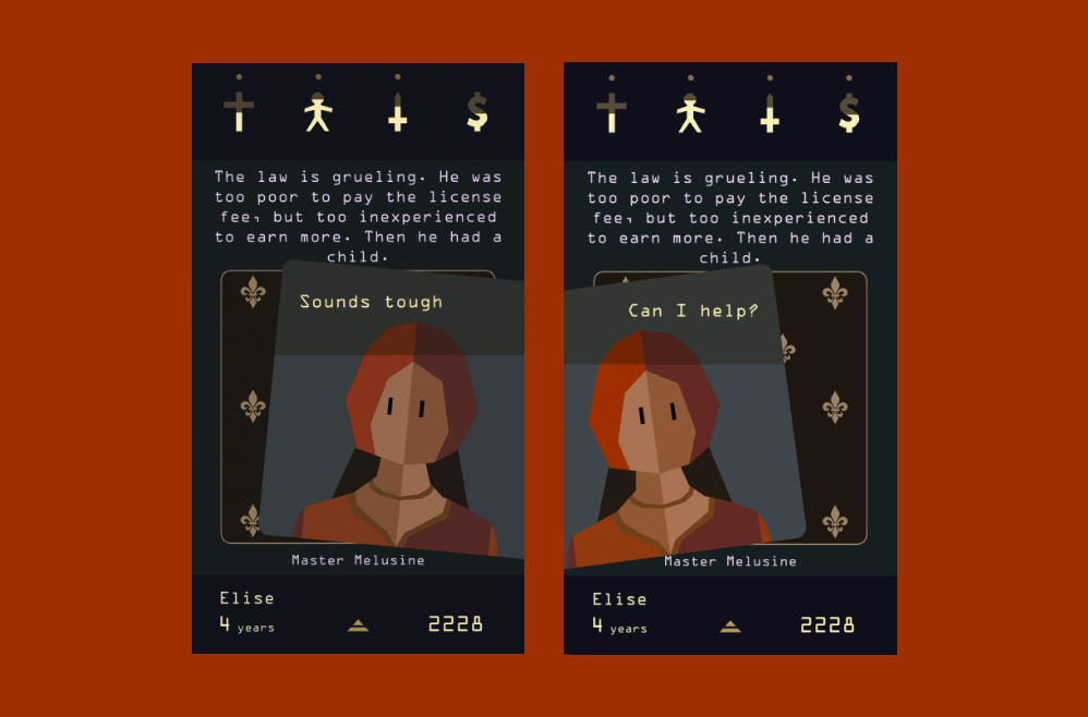 For the past two weeks I’ve been ruling centuries of kingdoms in Reigns: Her Majesty, reincarnated as queen in perpetuum. The iOS game succeeds its king-centric predecessor, Reigns, in which the player makes choices to advance the narrative by swiping left or right on cards, as in Tinder. Reigns: Her Majesty is not simply a version of the original game with an almighty female head of state, but is instead a complex examination of the contradictory obligations and impossible choices for a woman in (proximity to) power.